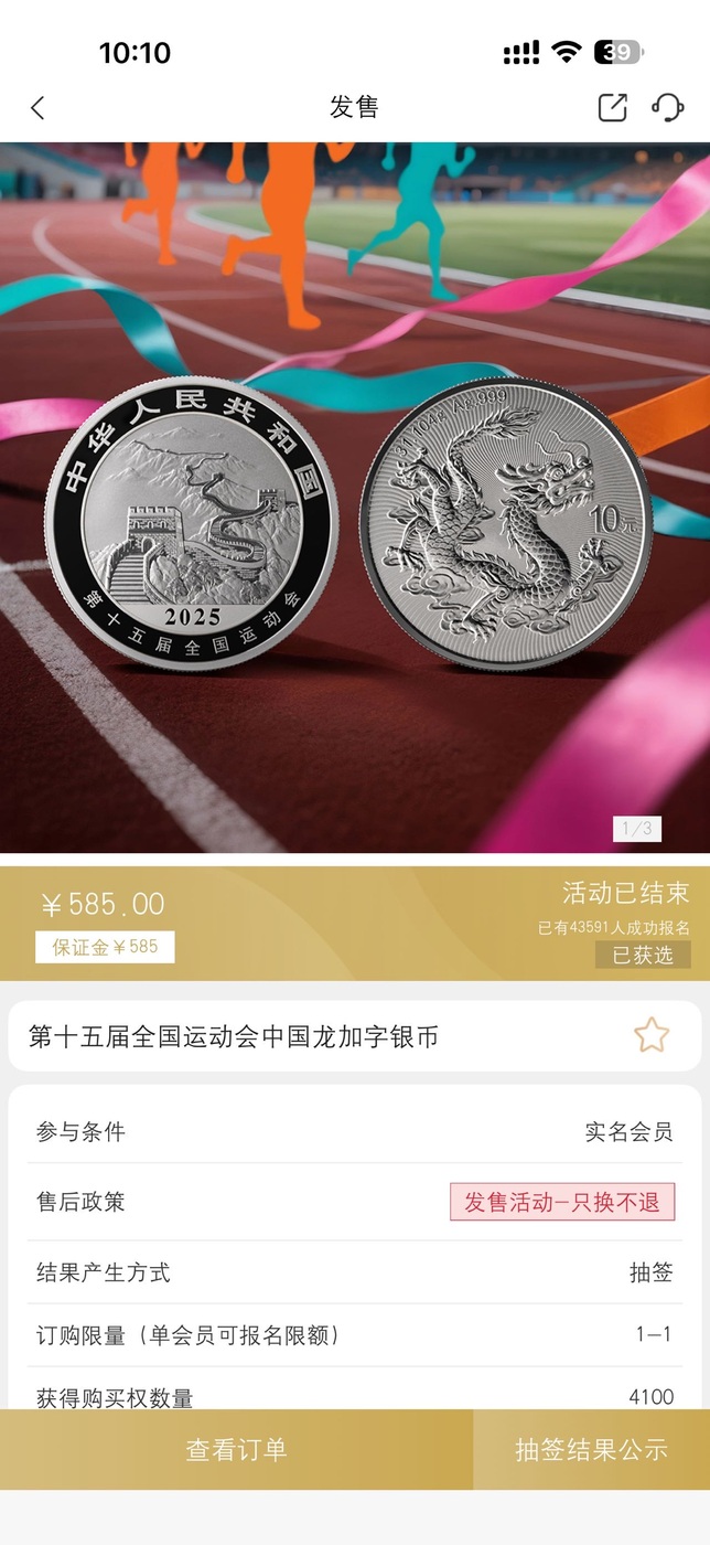 出已中签的首枚加字龙银币,第15届全国运动会