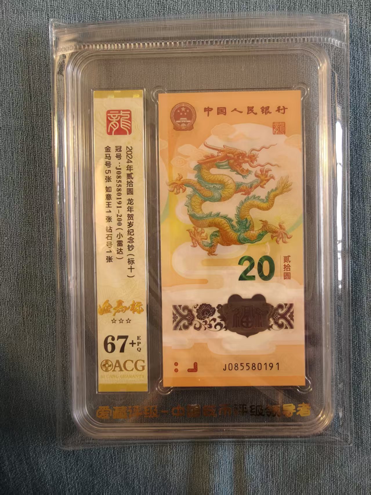 出小龙钞爱藏67加金马车尾95标十,最后一张0258龙四组合,售价11000元