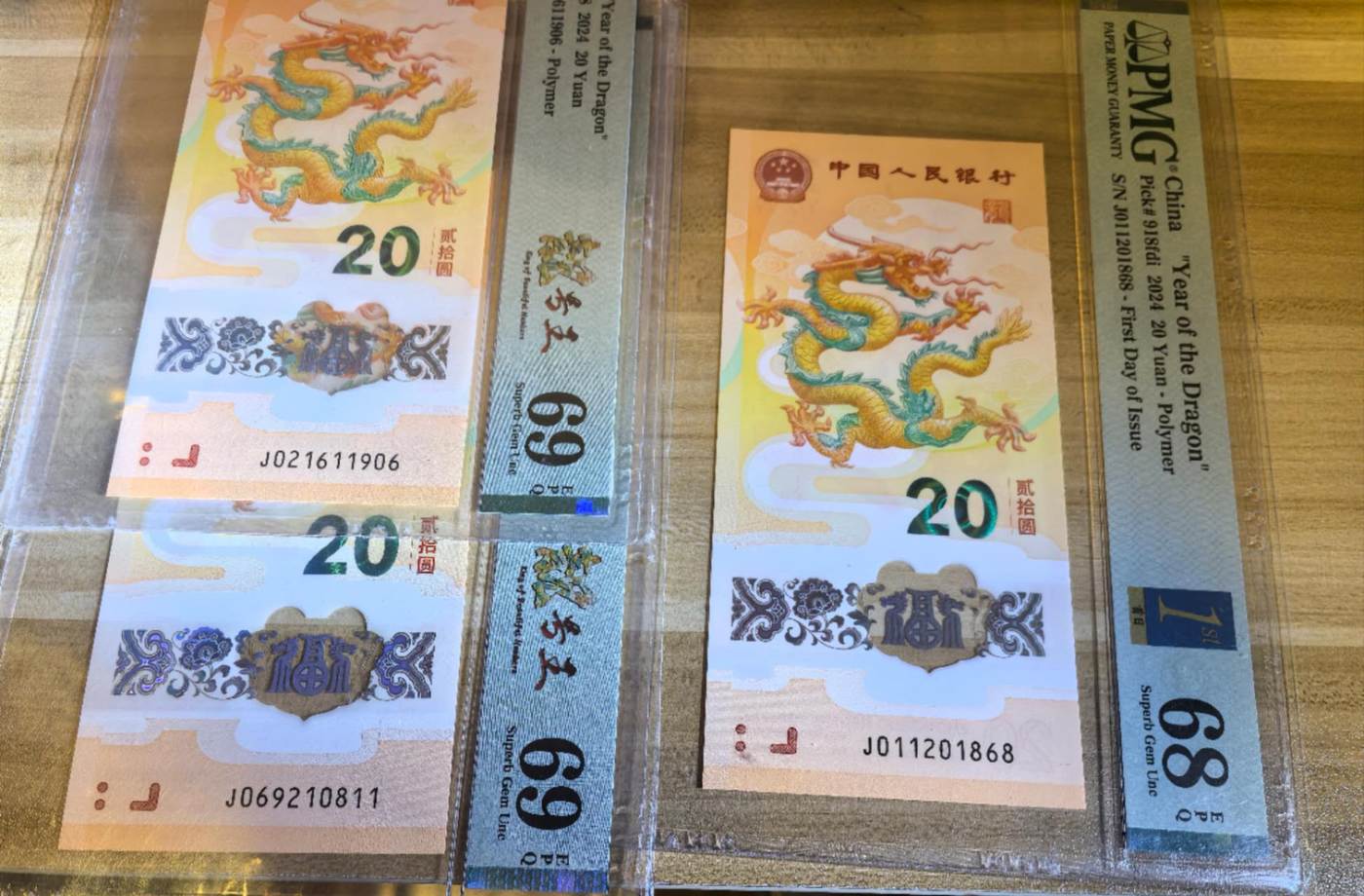 → 微信跟朋友谈好价格确认一张龙钞朦胧号首日金兰标尾8PMG68分,两张69分朦胧