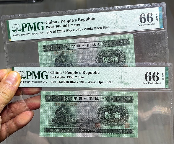 二版火车头贰角美评PMG66分,两张连号3200元一张,